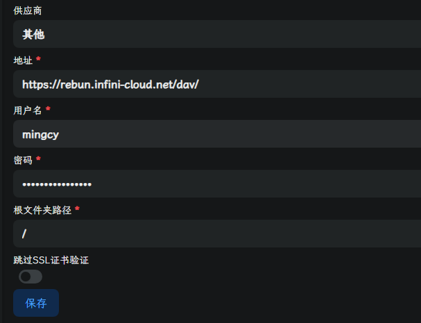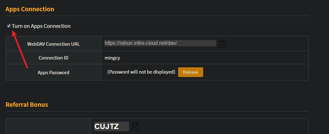 URL https://rebun.infini-cloud.net/dav/ Connection ID mingcy (你自己的账号) Apps Password ***************************
