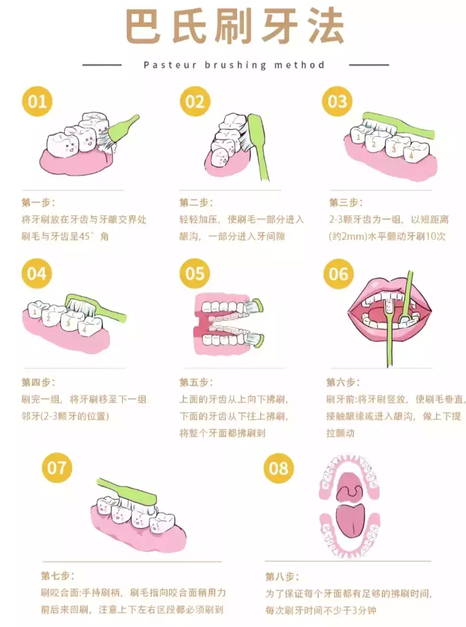 # 几个关键 Tips: - 每次只刷 2-3 颗牙,慢慢移动,不要急。 - 一定要选软毛牙刷!硬毛配合这个角度容易伤牙龈。 - 刷牙时间至少保证 3 分钟,别糊弄哦。 - 学会这个方法,坚持一周,你会发现牙齿真的干净很多,牙龈出血的情况也会慢慢改善!- 大家也可以在评论区分享一下,你是属于 “大力横刷派” or 巴氏刷牙法 “技术 (注:原文
