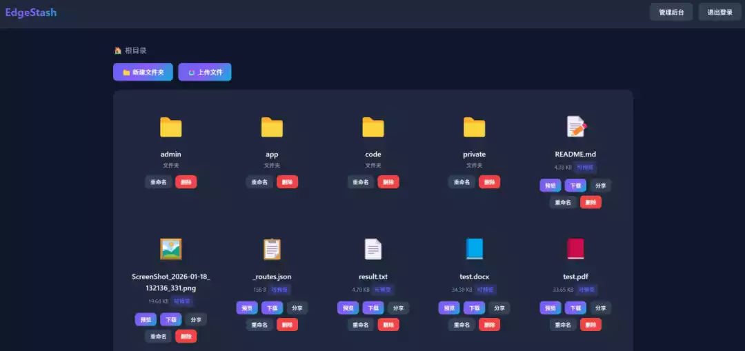 EdgeStash 支持带密码分享文件、在线预览 docx 或 pdf 文档、后台管理授权用户、查看分享文件浏览 / 下载量!