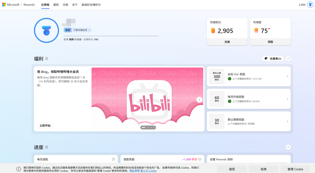 安装以后,我们保持在活动期间连接 7 天使用 Bing 搜索,即可获得 B 站一个月的大会员了。